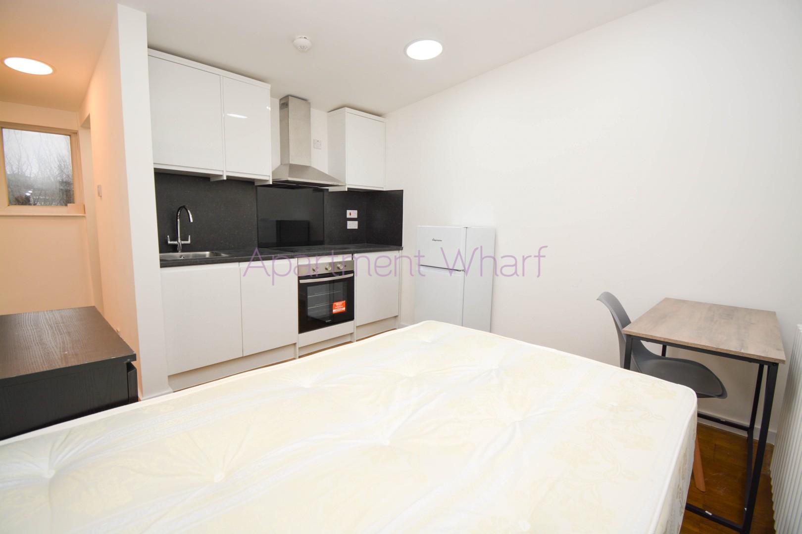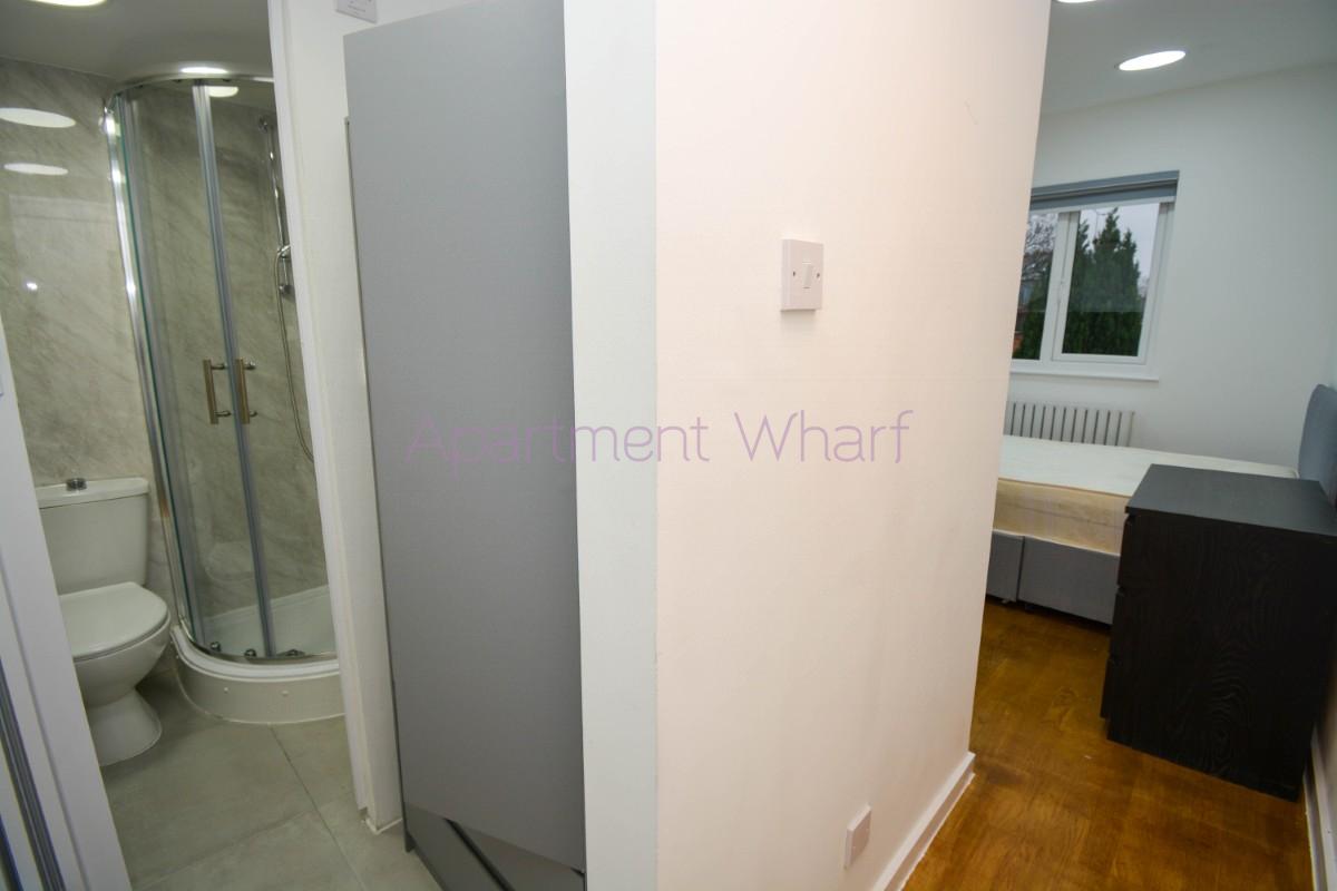 Is a modern, self-contained studio located at Edwin Street, London, E16 1QA, within a well-maintained house of six studios in the Canning Town area. The property has a shared back garden